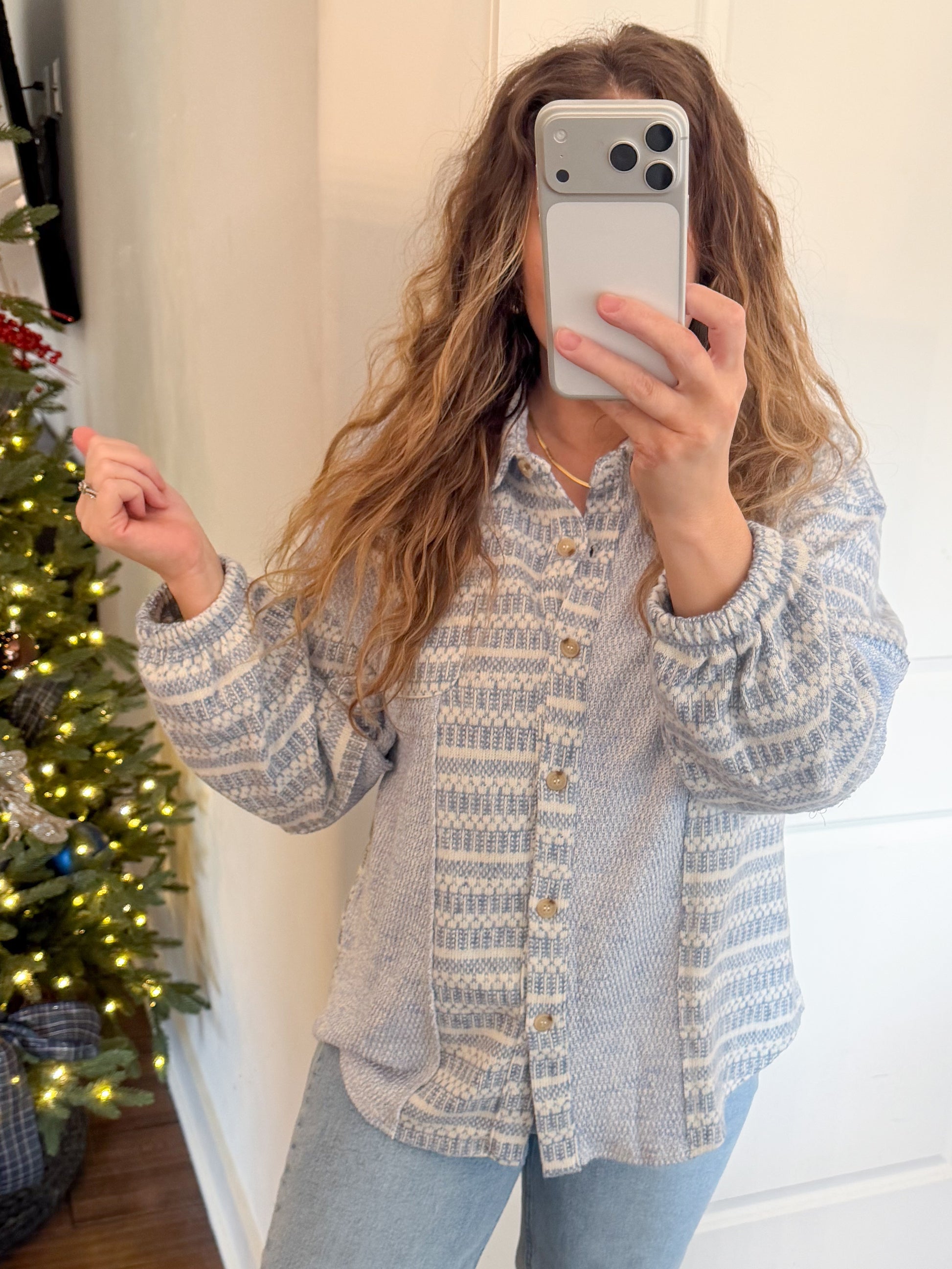 Your go-to layer for chilly mornings and casual days. The Blue Ridge Shacket has a soft textured feel, relaxed fit, and easy button-front styling that works open or closed. Throw it on over tees, knits, or dresses for an effortless winter layer.