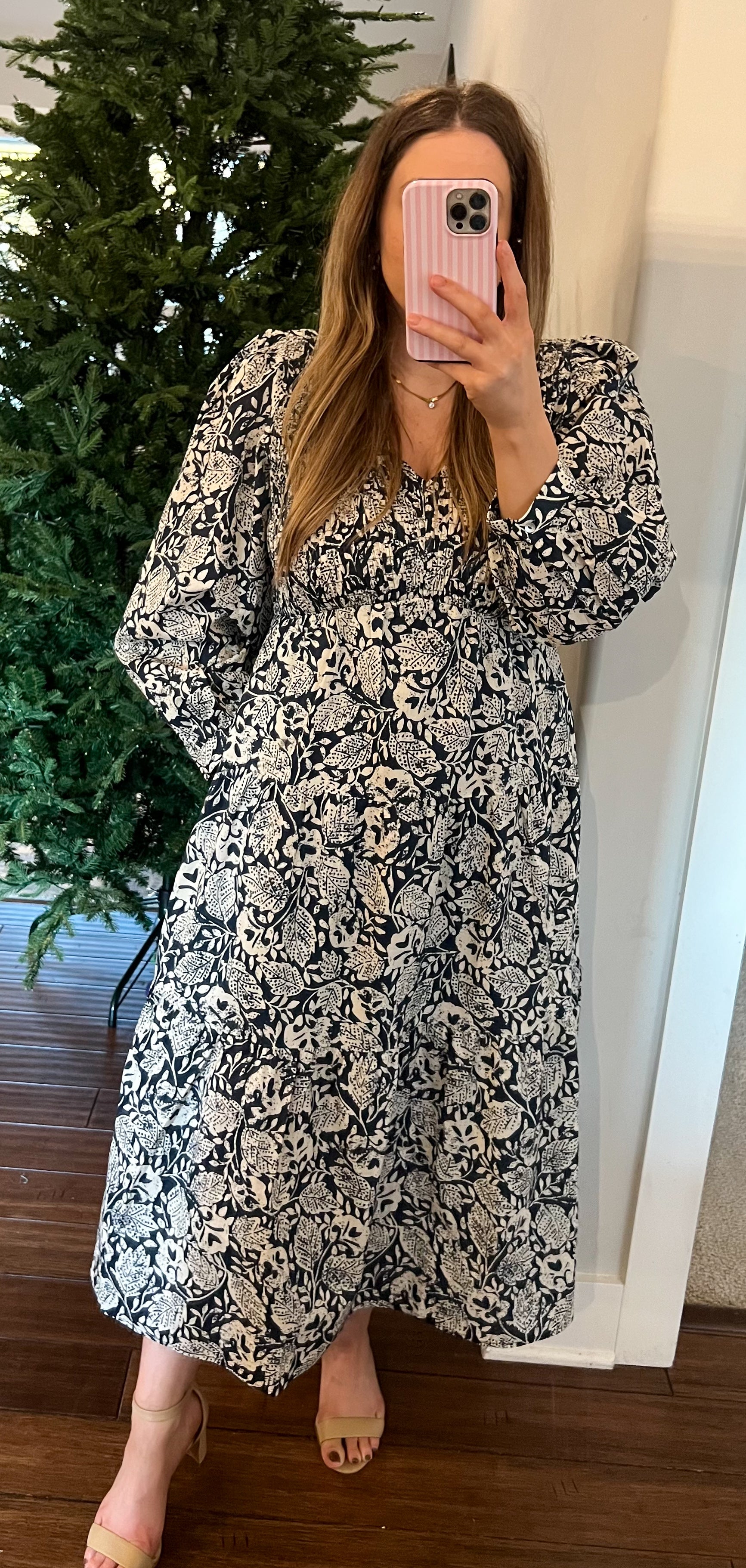 A navy floral maxi with a romantic fall-to-winter print and a flowy a-line silhouette. Lightweight, effortless, and perfect for church, dinners, or holiday events when you want something feminine but comfortable.